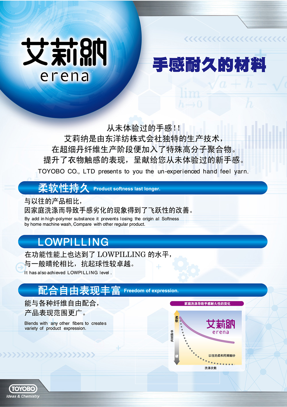艾莉納是由東洋紡株式會(huì)社獨(dú)特的生產(chǎn)技術(shù),在超細(xì)旦纖維生產(chǎn)階段便加入了特殊高分子聚合物,與一般腈綸相比,抗起球性較卓越。