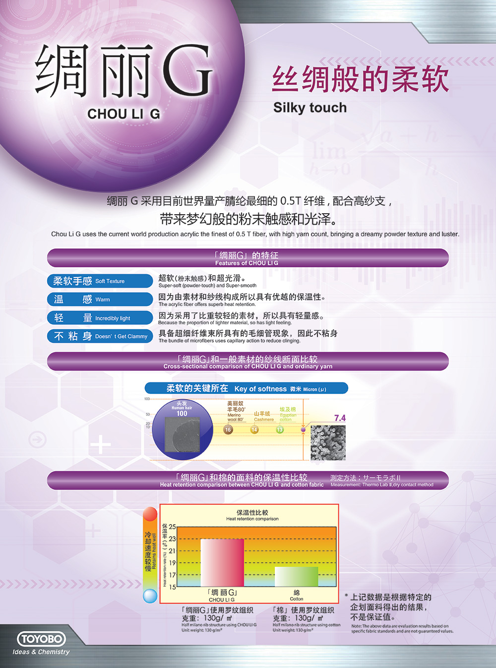綢麗G采用目前世界量產(chǎn)腈綸最細的0.5T纖維,配合高紗支,帶來夢幻般的粉末觸感和光澤。